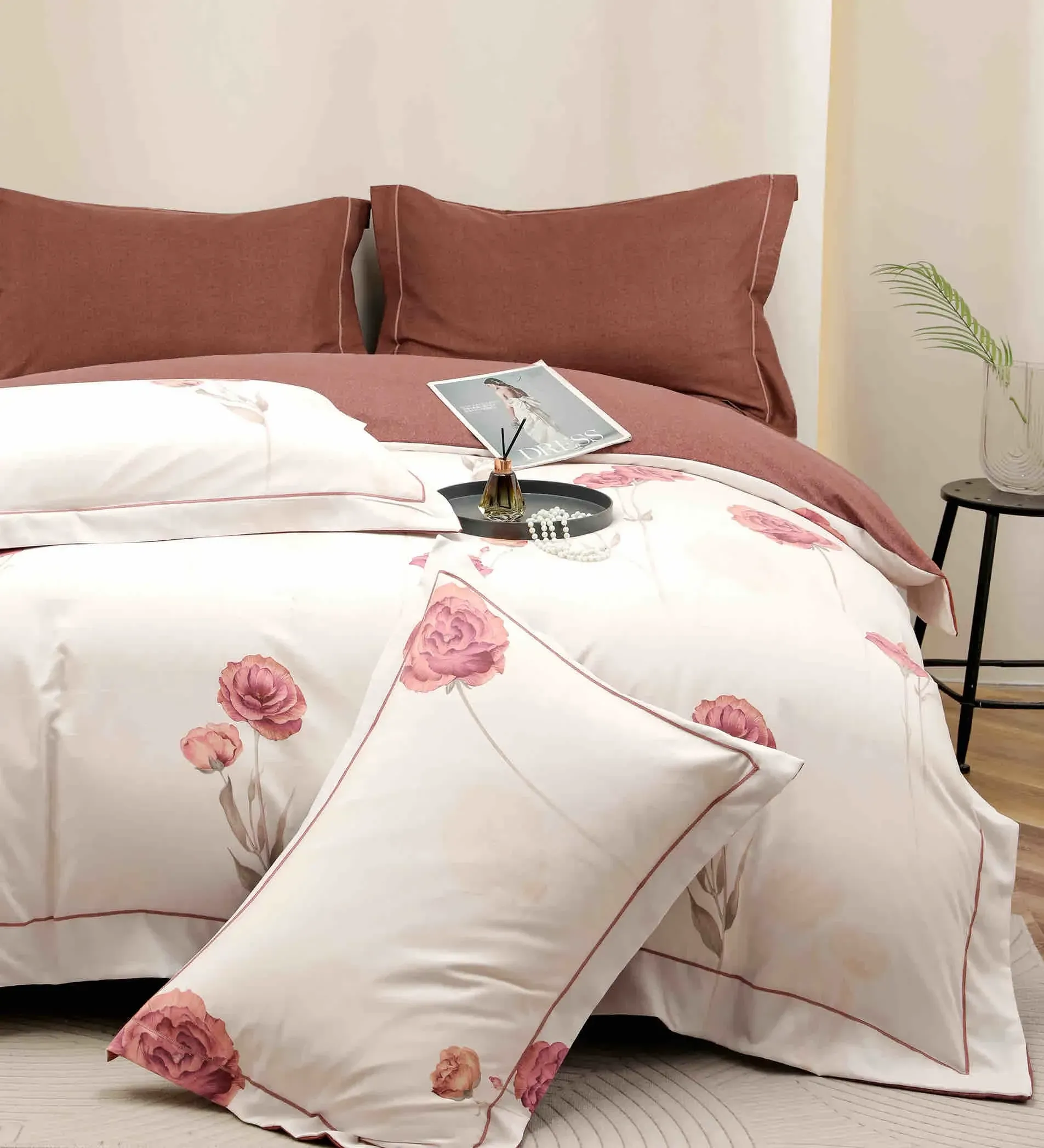 - Design elegant: Model floral rafinat în nuanțe de alb și caramiziu, perfect pentru a adăuga o notă de prospețime dormitorului.